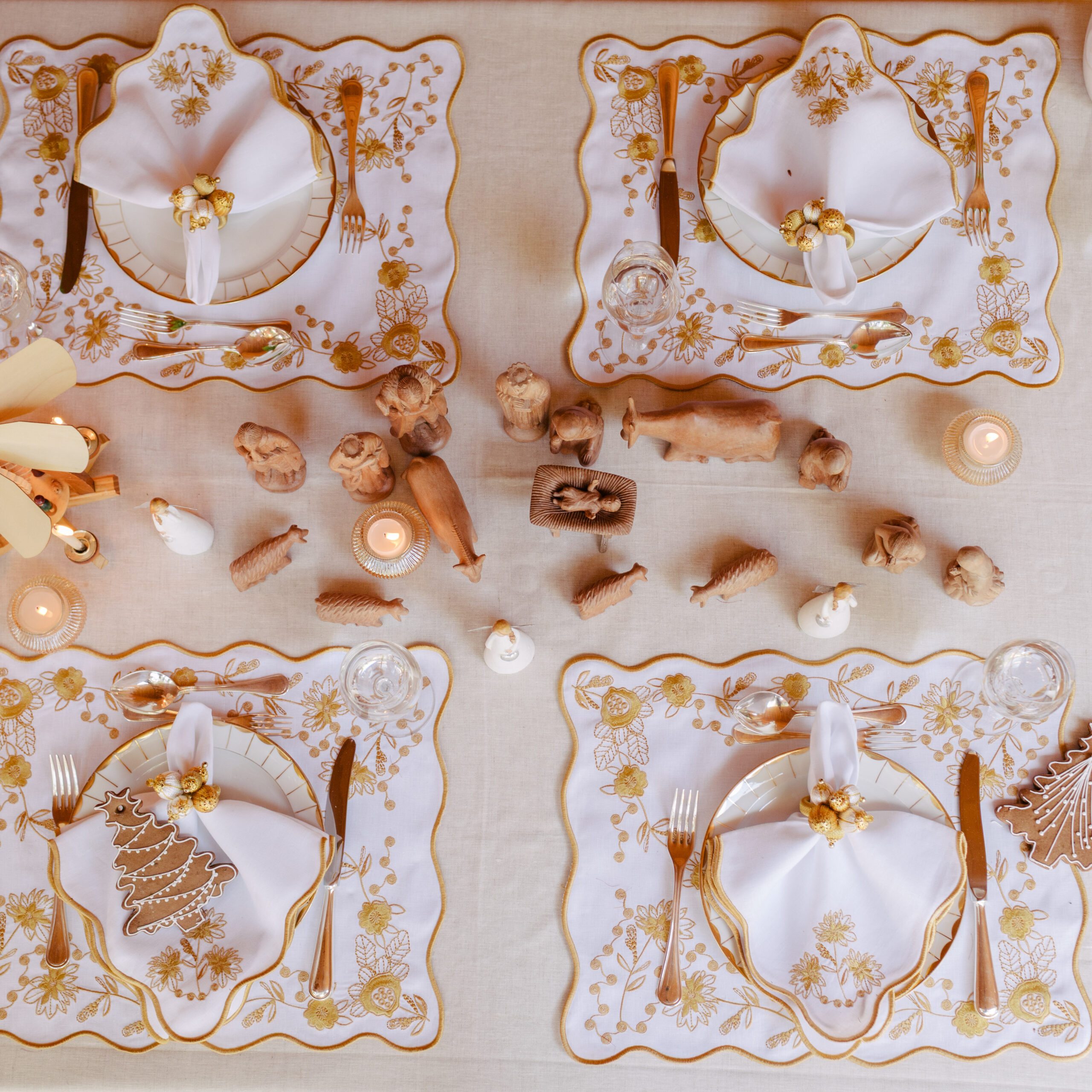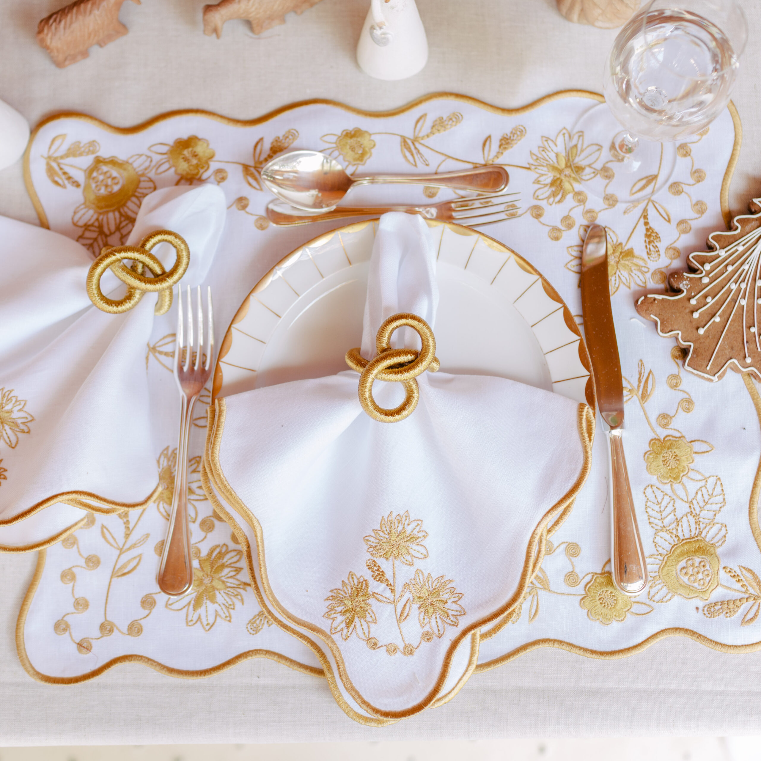 Cjto jogo americano e guardanapo linho flores douradas- Tati Pilão