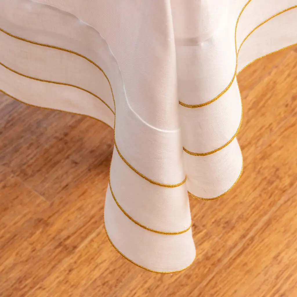 Toalha de Mesa Linho Branco com Camadas em Pesponto Dourado